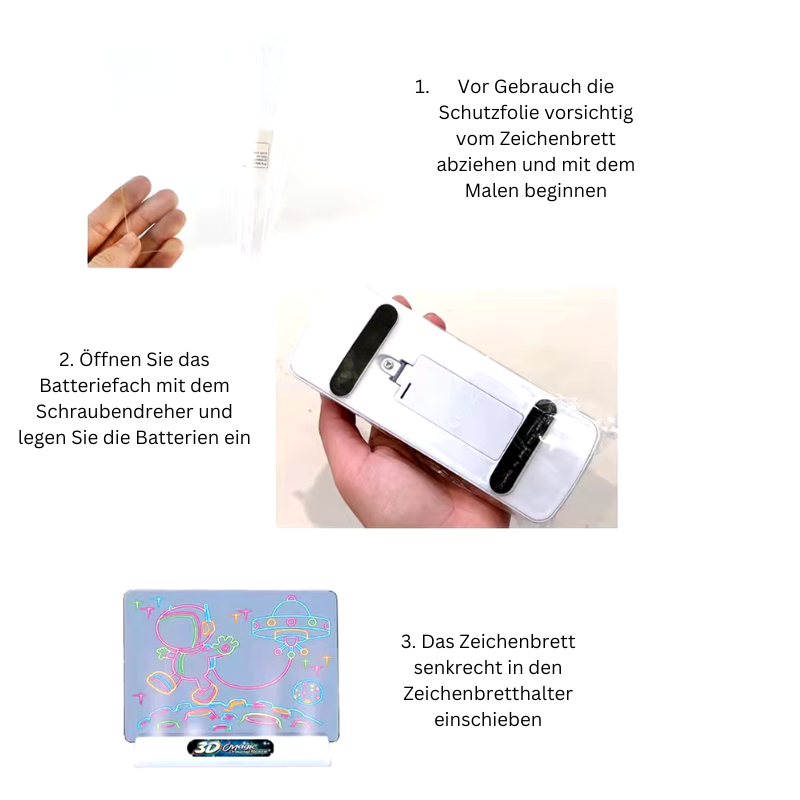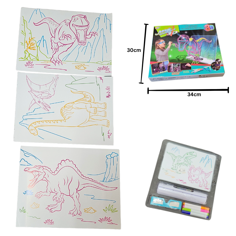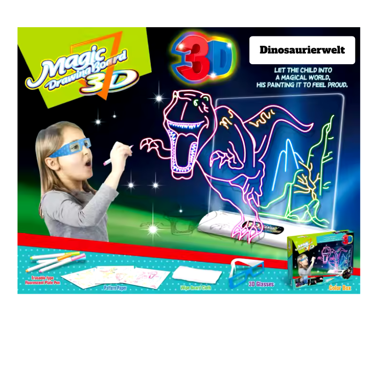 Lassen Sie Ihr Kind in eine Welt voller Fantasie und Kreativität eintauchen! Mit dem 3D Magisches Zeichenbrett Set – Dinosaurierwelt-Vorlage wird jedes Kunstwerk zum leuchtenden Abenteuer. Dieses Set wurde speziell entwickelt, um Kindern die Möglichkeit zu geben, ihre Vorstellungskraft spielerisch zu entfalten und beeindruckende 3D-Kunstwerke zu erschaffen.
