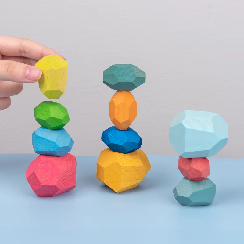 Beim Stapelspiel der ungleichmäßigen Holzsteine trainieren Kinder gezielt ihre Fingerfertigkeit und Hand-Auge-Koordination. Jeder Stein hat eine andere Form, was die Herausforderung erhöht und Konzentration sowie Geduld erfordert.