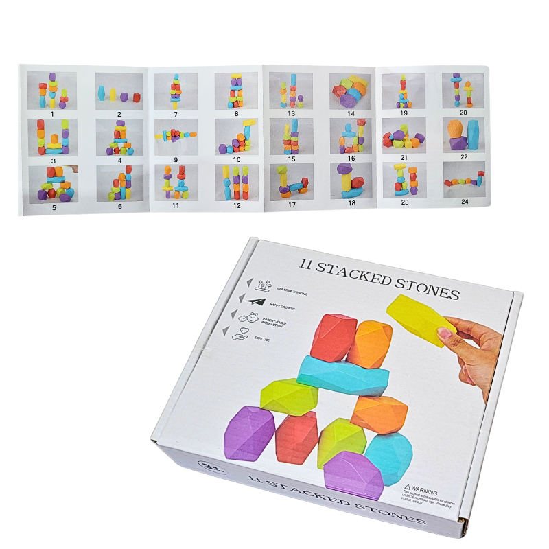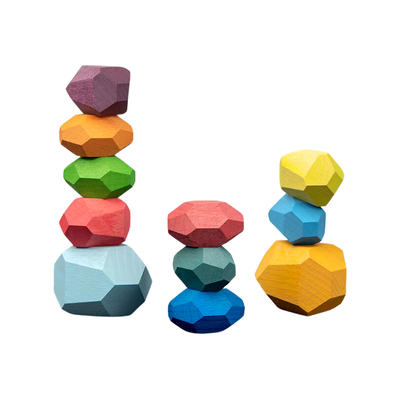 Die Steine sind aus umweltfreundlichem Naturholz gefertigt und mit ungiftigen Farben bemalt. Abgerundete Kanten und eine glatte Oberfläche machen das Spielzeug besonders sicher für kleine Kinderhände.