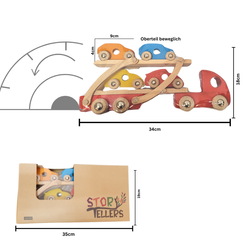 Der Bunte Holzspielzeug-Lkw bietet den Kleinen eine Vielzahl an Spielmöglichkeiten. Dank des abnehmbaren Anhängers und der bunten Autos können Kinder ihre Fantasie freien Lauf lassen. Die Möglichkeit, den Anhänger zu senken und die Autos herausfahren zu lassen, unterstützt die Entwicklung von Feinmotorik und Konzentration auf spielerische Weise.