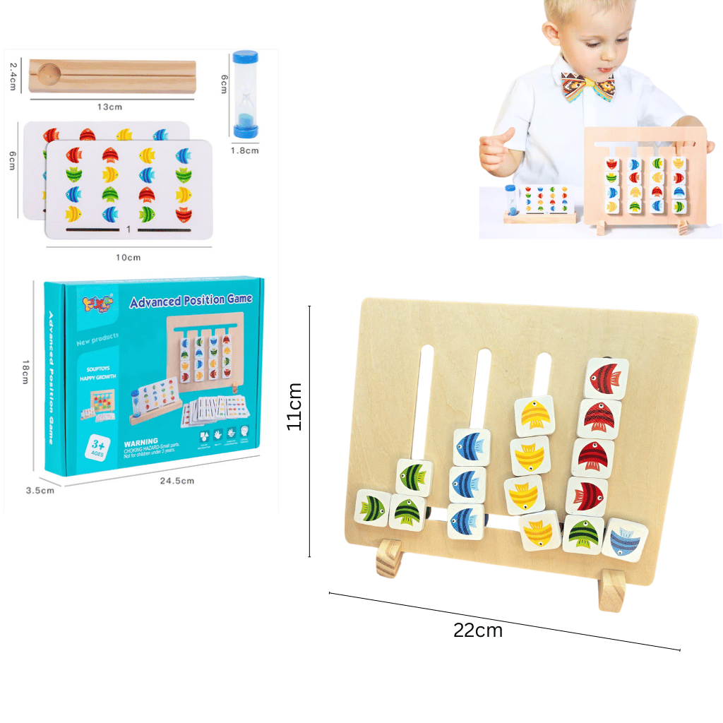 Jede Karte stellt eine neue Herausforderung dar! Mit verschiedenen Farb- und Richtungsanforderungen müssen die Holzfische auf dem Spielbrett so platziert werden, dass sie dem abgebildeten Muster entsprechen. Die Sanduhr sorgt für zusätzlichen Nervenkitzel und motiviert Kinder, das Puzzle in der vorgegebenen Zeit zu lösen.